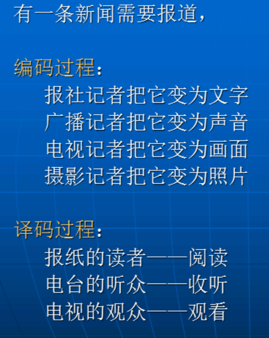 编码就是把信息转变为可供传播的符号或代码。即把信息装到传播符号上。编码同传者有关。