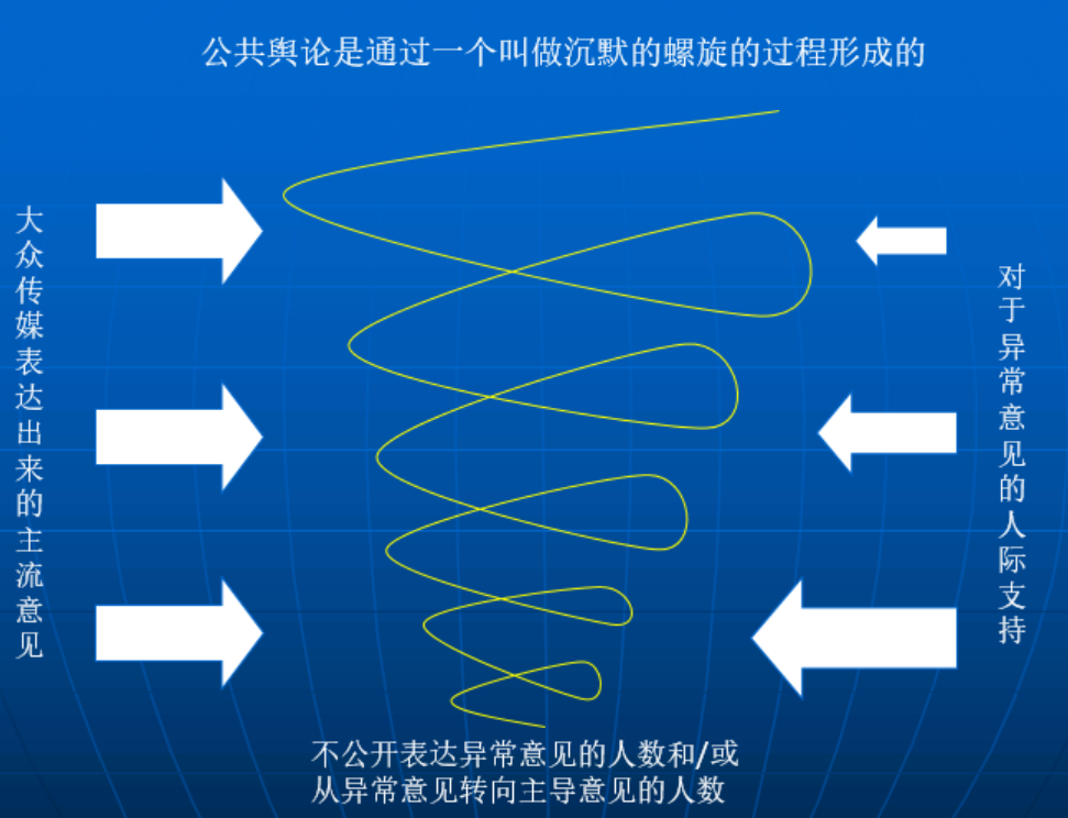 大众传播所鼓吹的观点被人们认为是主流观点,于是持异见的人避免发表自己的意见,人际支持也随之减弱,最终“把一种意见确立为主要的意见。”