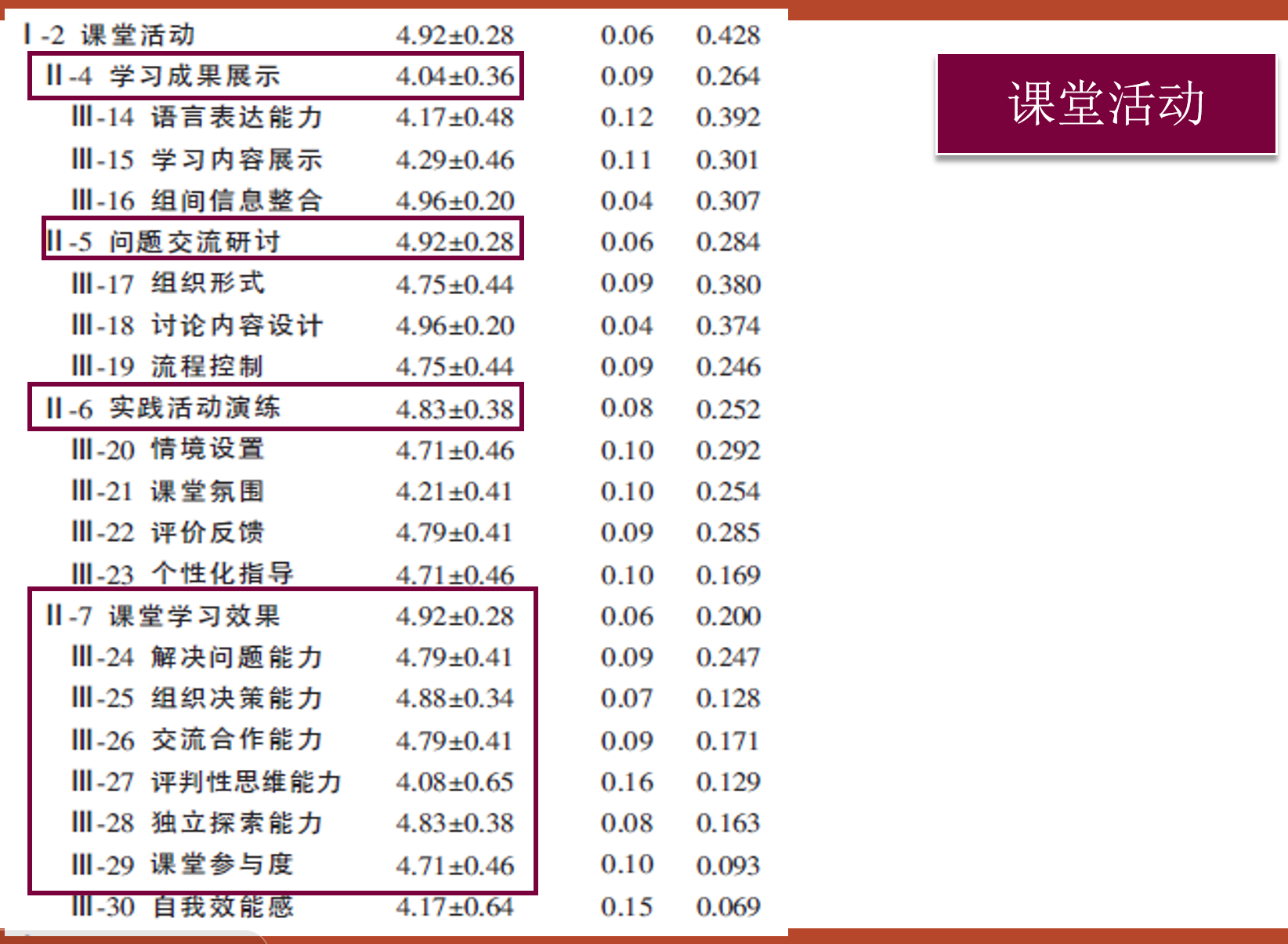 - 学生的反应:教学的清晰性、各个部分的逻辑联系、教学策略的质量、教员的工作质量及环境的舒适性;