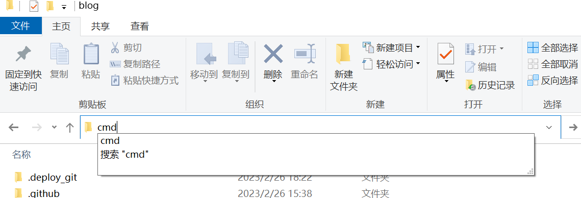 使cmd跳转到blog文件夹下,比如在文件管理器中访问blog文件夹,在地址栏输入cmd,点击回车