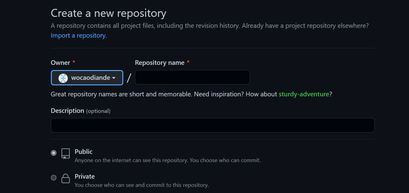 - 在仓库名一栏填写username.github.io,uername是你的GitHub用户名,其他不用管,直接建立仓库即可。
