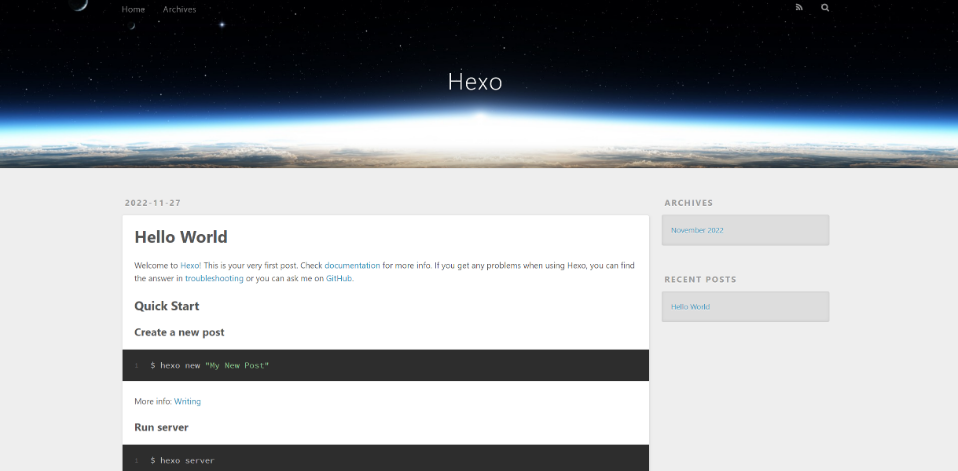 hexo s- 等待其运行完成后,会看到https//localhost:4000/,将其输入到本地的浏览器中,就可以看到网站的样式。