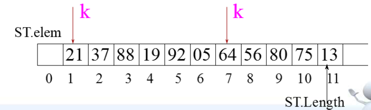 假定给值定值e=64,要求ST.elem[k]=e,问k=?
