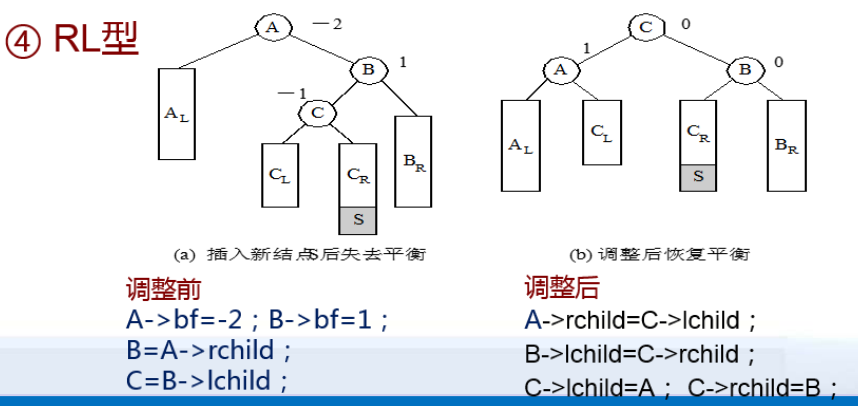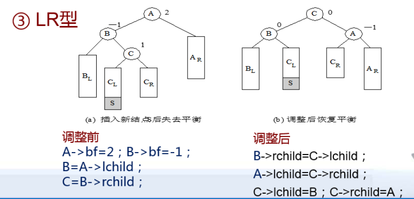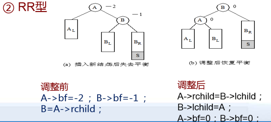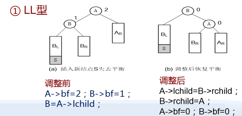 所谓最小不平衡子树是指:以离插入结点最近、且平衡因子绝对值大于1的结,点作根结点的子树。可归纳为下列四种情况:① LL型② RR型③ LR型④ RL型