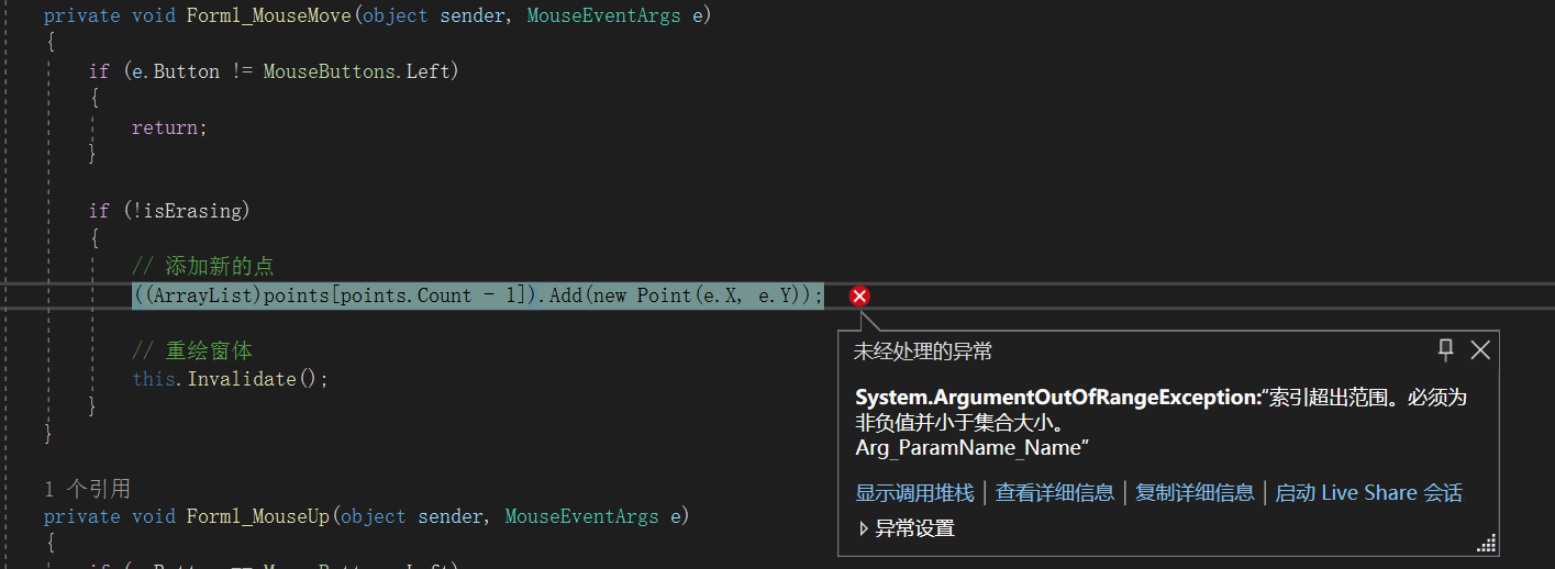 }然而这就造成了一个问题,在将所有的点都清除后,(ArrayList)points[points.Count - 1]其中points.Count会变成0,所以points.Count-1就会成为-1,造成索引失败,如下图。